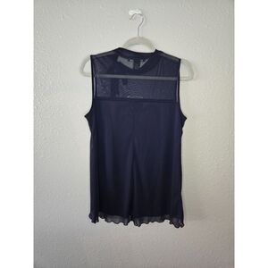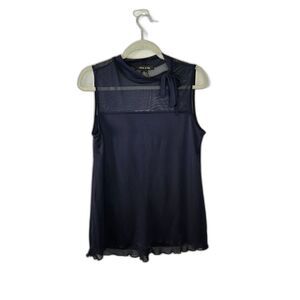 Adele & May Women's Navy Blue Mixed Media Sleeveless Top. Sheer at neck with tie. Size Medium. Excellent Used Condition.