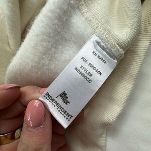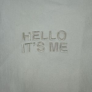 This is an Adele Unisex Official Merch Hello It's Me Fleece Sweatshirt in size Large. It is a cream-colored pullover sweater featuring a Crew Neck and Long Sleeves. Made by Independent Trading Company, it is a heavyweight fleece fabric with a design inspired by the singer Adele. Ideal for fans of the artist looking for a cozy and stylish sweater.