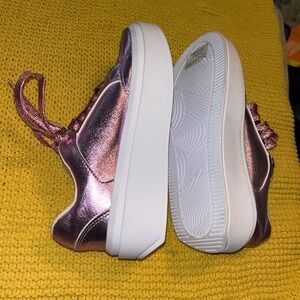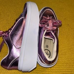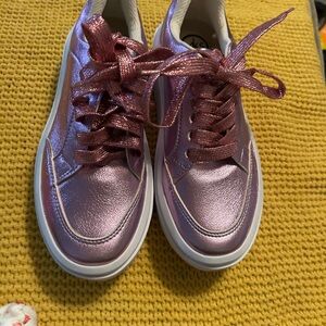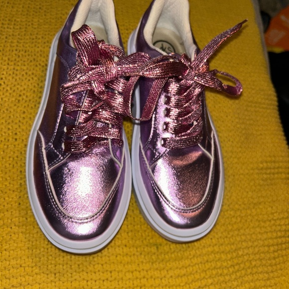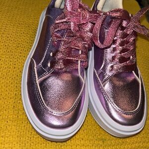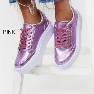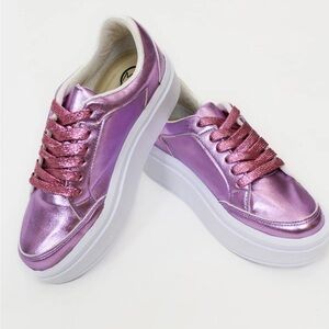 Step out in style with these shiny pink sneakers. Perfect for adding a pop of color to any fit with its sparkly laces! The footbed has a thick comfy padding with arch support which makes them easy to wear for a long day of walking. The design of these sneakers is very lightweight and the platform is the perfect height ,Platform Height: 1.5"
