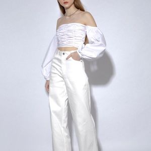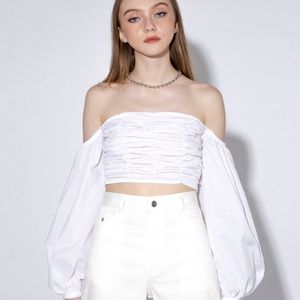 Perfect with jeans, shorts, or a skirt, this perfect summer top will fit into any wardrobe. With on-trend off-the-shoulder sleeves and flattering ruching, you can take this top to any summer occasion.