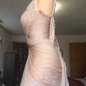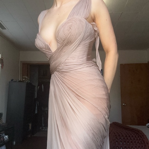 Adelie Plunging Draped Plisse Slit Gown In Desert Rose