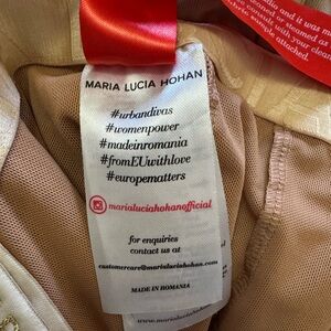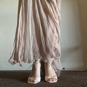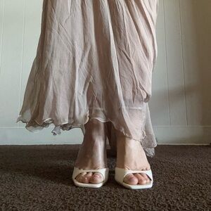 Maria Lucia Hohan’s “Adelie” gown is crafted from layers of delicate silk mousseline, featuring the designer’s signature soft pleating and fluid movement.