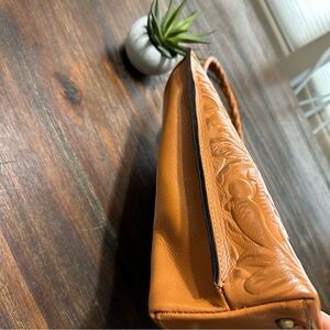 Patricia Nash Adeline Cognac Tan Brown Gold Tooled Cutout Leather Satchel shoulder tote bag with sections for organization. Floral cutouts with gold under. Gently used and in good condition. There is a puncture mark shown in photos.