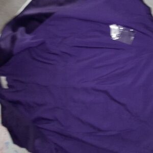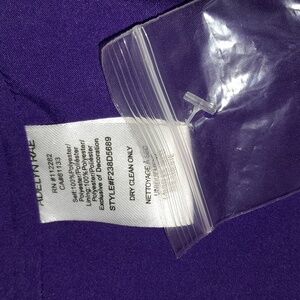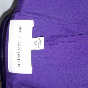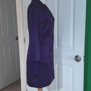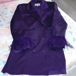 Size XS Vibrant purple satin blazer dress w/ three button closure in front, feather cuff detail. 15.5 in. across back and 33 in. length. EUC, worn once.