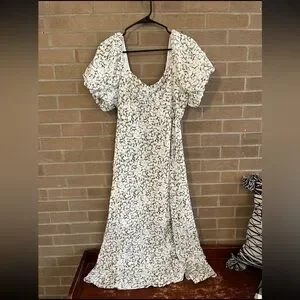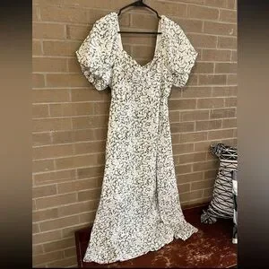 Embrace elegance with this floral puff sleeve maxi dress. Perfect for any occasion, this dress features a beautiful white and black pattern. Ideal for a chic and stylish look.