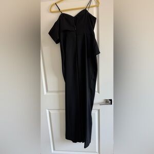 Elegant black dress with cascading ruffle across the bodice. Thin spaghetti straps and a fitted silhouette. Sleek floor-length design for formal events. Timeless, minimal styling.