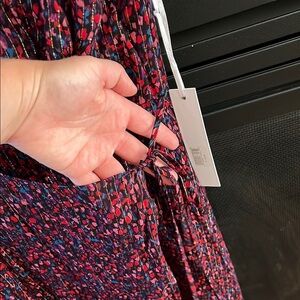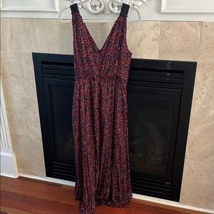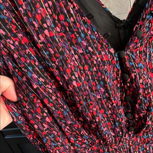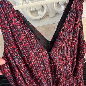 Turn heads with this chic high low dress, featuring a striking black and red design. Perfect for any occasion, this sleeveless dress adds a touch of elegance to your wardrobe. Gold striped going through it . Midi length . Wrap style with tie . GORGEOUS