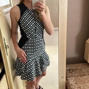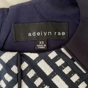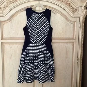 Adelyn Rae sleeveless cocktail dress for sale. Falls mid-thigh on me and I’m 5’3. The dress is fitted with a layered ruffle about 9 inches up from the bottom hem. The navy blue panels on the sides are designed perfectly to make your waist look tiny! It’s a very comfortable and well-made dress. The back has a zipper and clasp at the top. I wore it once to a promotion ceremony for my husband and it’s in excellent condition!