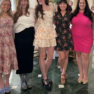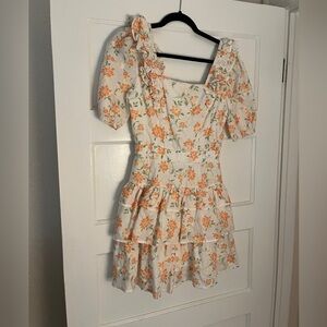 Chic floral ruffle dress perfect for any occasion. Features a beautiful floral pattern embroidered onto the dress and cute ruffles
