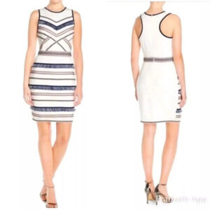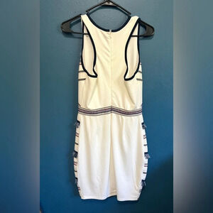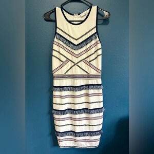 Beautiful Adeline Rae sheath dress with fringe and embroidered stripes, above knee length, and zipper back with hook and eye. Excellent condition, size small