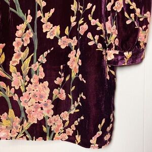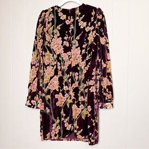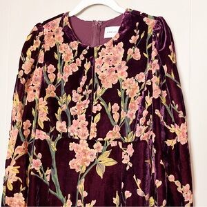Elegant long sleeve dress with floral design. Features pink blossoms on a rich purple background. Perfect for any occasion.
