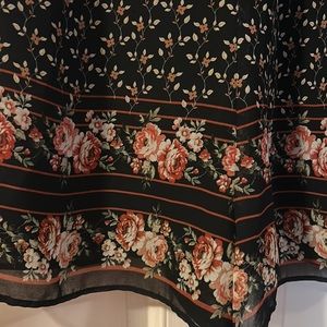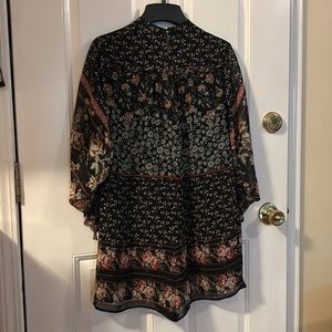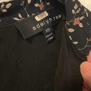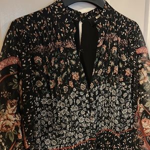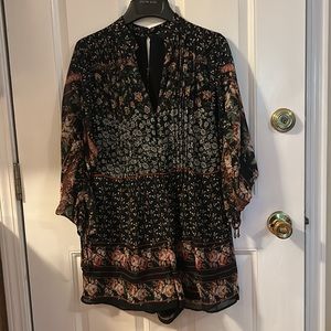 Super cute floral romper from Adelyn Rae. Black with various floral patterns all over. Sheer long sleeves that can be synched. Buttons down the front and claps in the back. Super flattering and can be dressed up or down. Worn a handful of times but in good shape. 100% polyester. Lining: 100% nylon. Happy shopping!