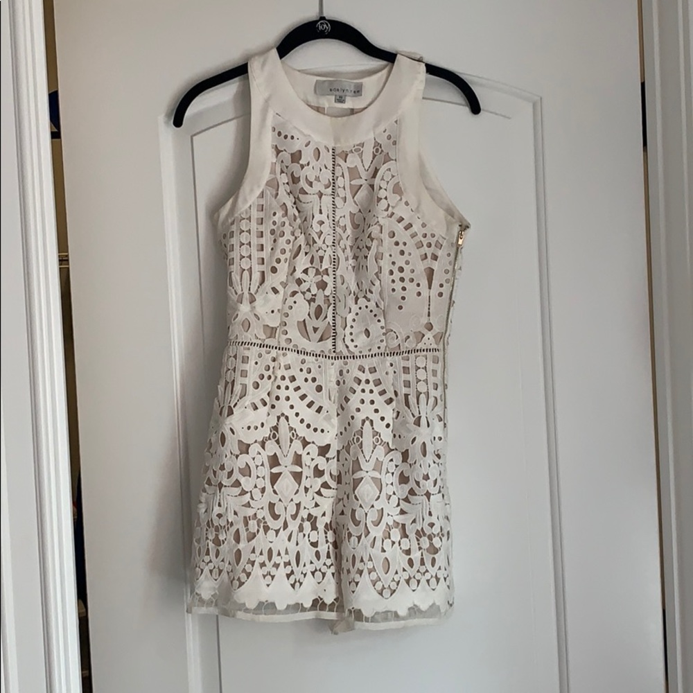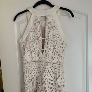Super cute jumpsuit, perfect for bachelorette or bridal shower. Won once and there are some marks from makeup. This will need to be dry cleaned but I have no doubt the makeup will come out!