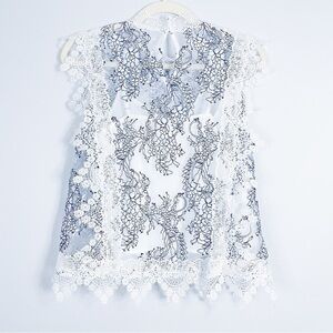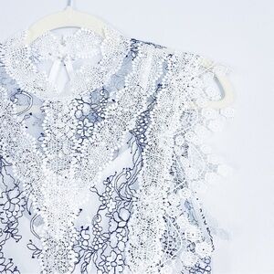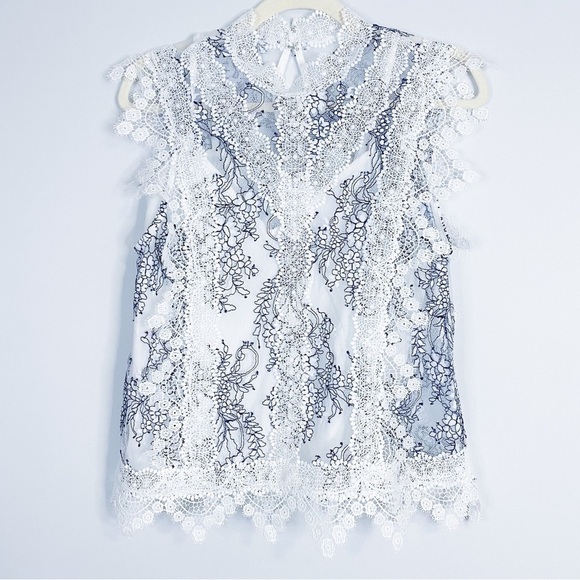 Adelyn Rae white and navy sheer lace overlay top with white tank lining.