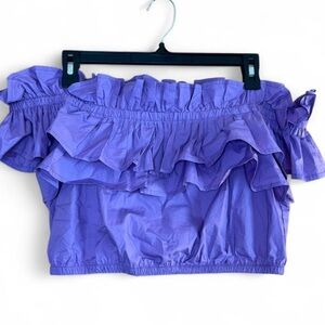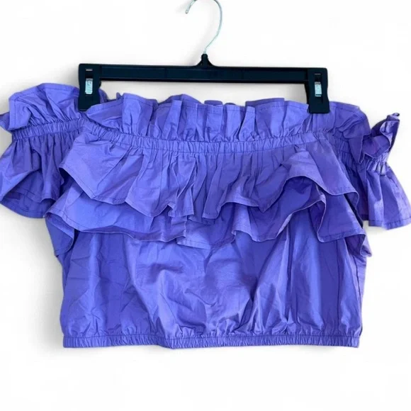 Elegant lavender top with ruffle accents. Ideal for a fashionable ensemble.