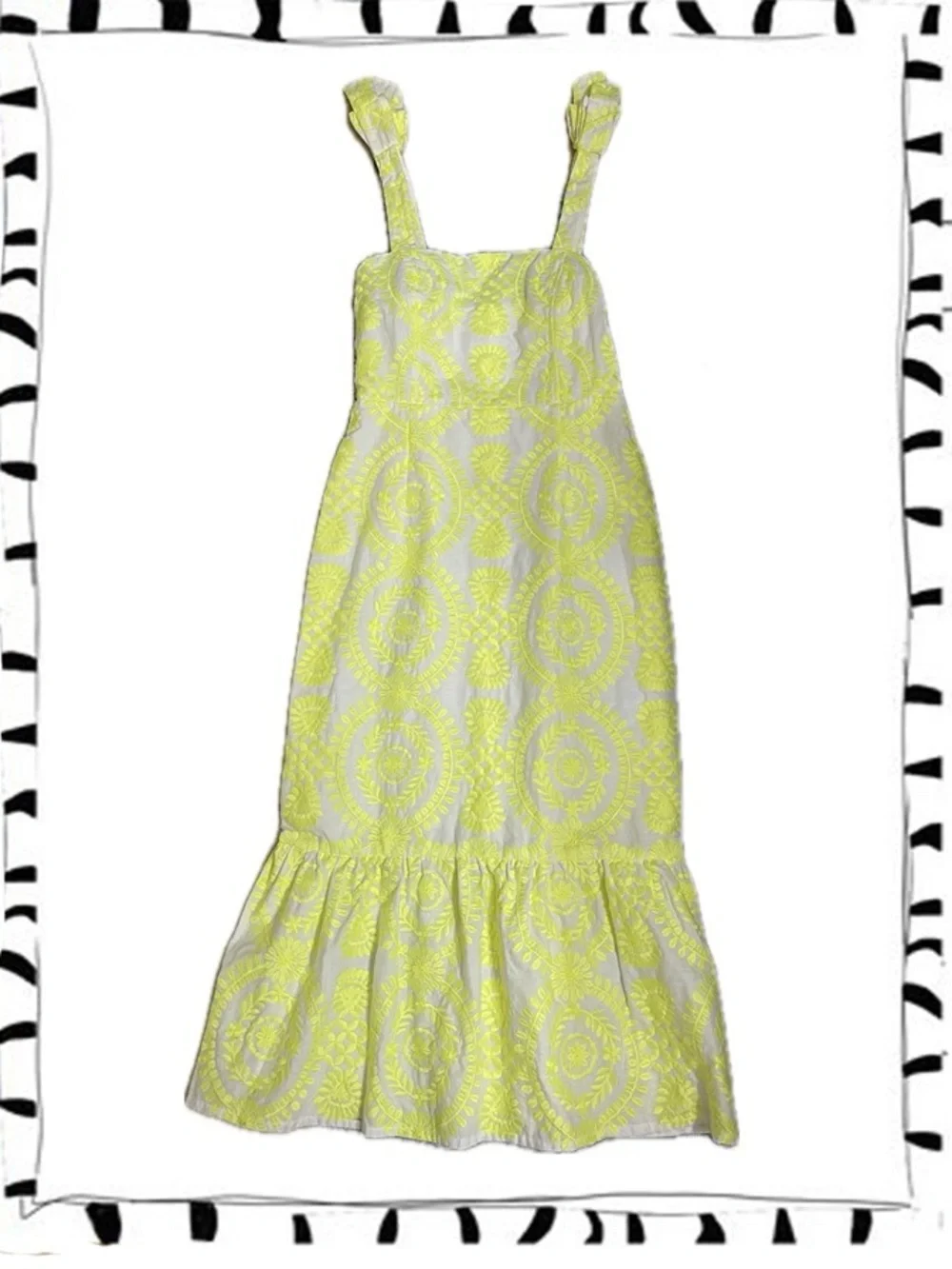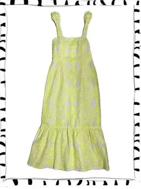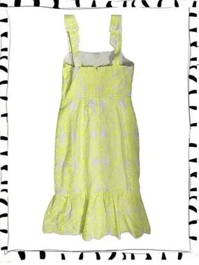Adelyn Rae sundress in lemon yellow. Textured embroidered fabric with smocking at the back. Sleeveless style with lining and brand tag. Bright, summery hue.