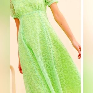 This spring say hello to bright colors! The Suki Midi Dress is made of a neon floral embroidered fabrication and features a crew neckline, slight puff sleeves, an open back with self-tie detail, and an a-line skirt. Fully lined.