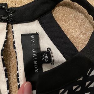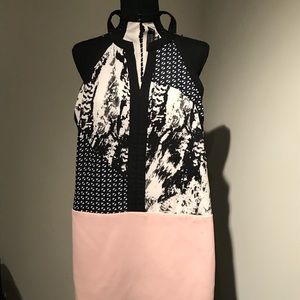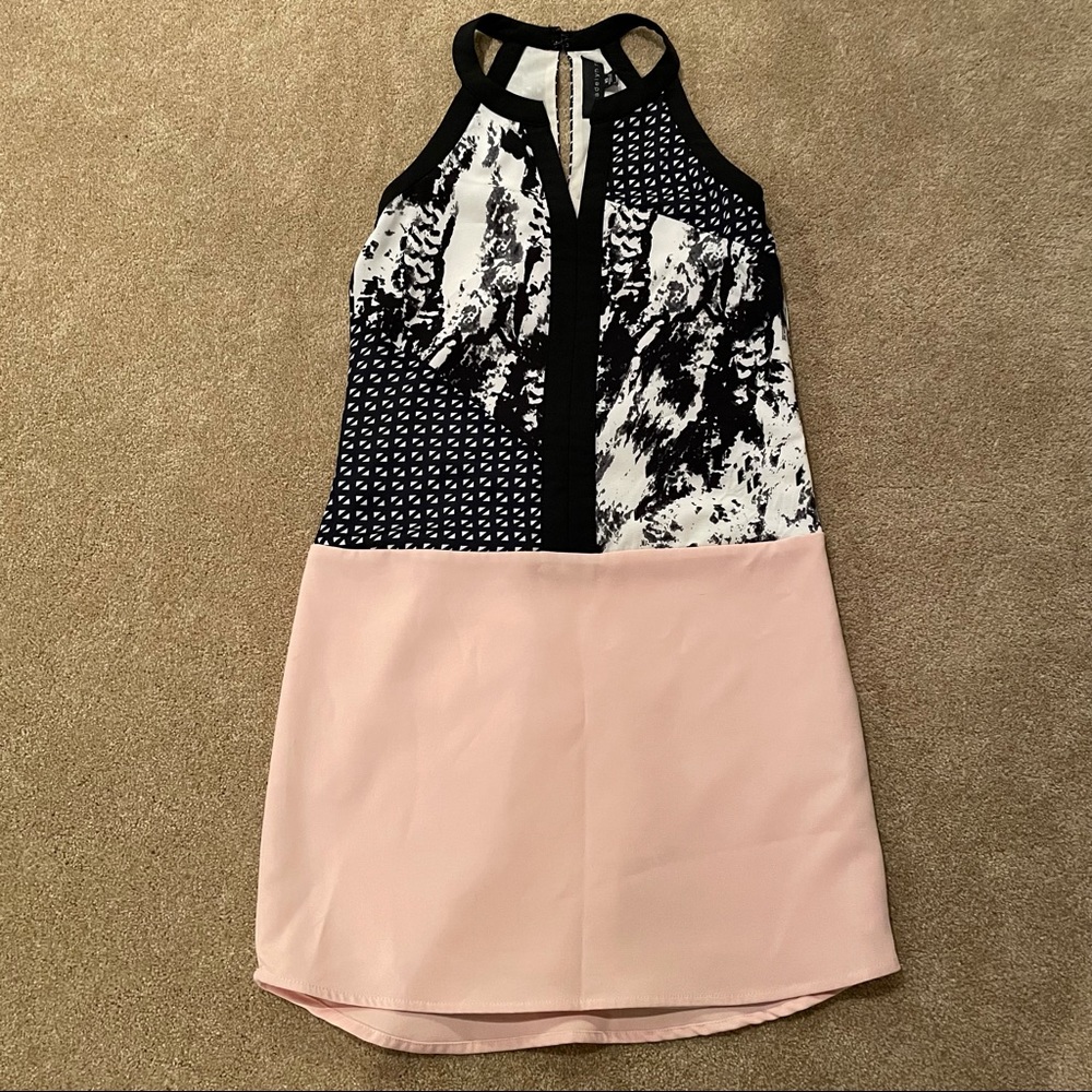 Adelyn Rae size XS racerback mixed print dress. Knee length (5’7” for reference). Super soft and airy material. Never worn only tried on. The back is less than 1inch longer than the front. Black and soft pink. Fine print: Back hook could use a little love!