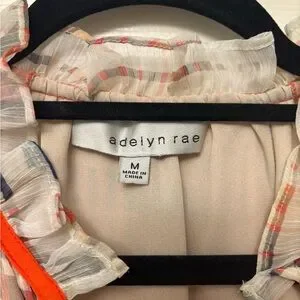 Romper with ruffled neckline. Features an orange multicolor plaid pattern.
