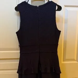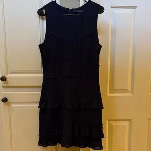 Chic navy blue dress with ruffle accents. Sleeveless design. Perfect for stylish outings. Wore once to a wedding.