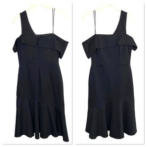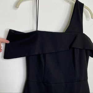 Medium-weight stretch knit shapes a wide, one shoulder strap, an off-the-shoulder neckline, and princess seamed bodice (with hidden boning). Bodycon skirt extends to a midi length and flaring, trumpet hem. Hidden back zipper/clasp.
