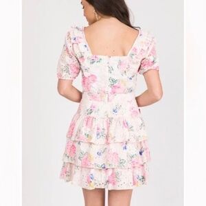 This dress is PRECIOUS and full of detail. It's covered in a pink floral print and eyelet cutouts, and ruffles add to the super cute and girly look. Dress is fully lined through the body and offers a back zip closure. Fit is true to size. Woven without stretch.