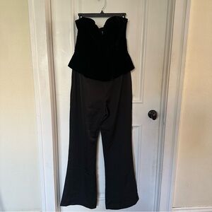 Adelyn Rae Plunge V Neck Black Velvet Strapless Satin Wide Pant Jumpsuit L NWT