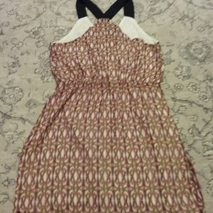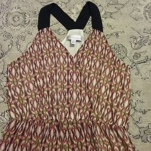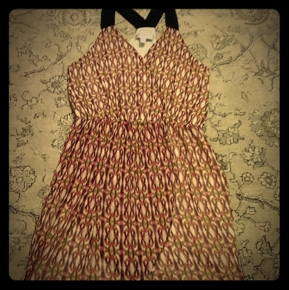 Light chiffon-style printed dress with black racerback straps. The waist is elastic and the bust has a snap closure. The skirt is faux wrap. Fully lined. Worn once. Excellent condition.