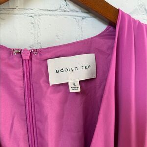 This elegant pink midi gown by Adelyn Rae is designed with a flattering ruched bodice and charming flutter cap sleeves, making it ideal for cocktail events or as a wedding guest. The dress features a sophisticated V-neckline and a beautifully draped skirt, offering a graceful silhouette.