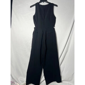 Adelyn Rae wide-leg sleeveless jumpsuit with a keyhole neckline and cutouts on the sides. It has a back zipper closure and a hook and eye closure at the top. The jumpsuit is new with tags. Size small.