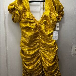 Vibrant yellow mini dress with ruched detailing. Perfect for standout style.