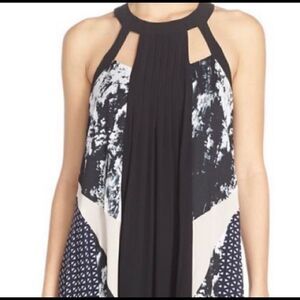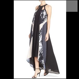 This flowing maxi dress features a high low hem with pleat in front, mixed media print, and halter neck with cut outs in front and back.