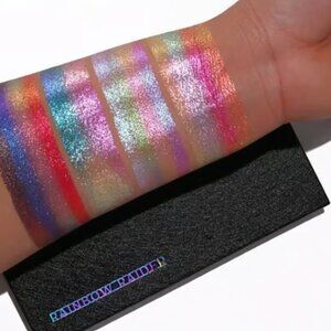 Another FUGLY palette, designed for the face, but safe for eye use and inspired by The Flash villain, Rainbow Raider. Featuring four (4) powder iridescent, rainbow highlighters with zero white cast. This palette is 100% free of talc, glitter, oil and BHT. (This palette is also vegan)