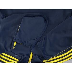 This sharp looking sweatshirt by Adidas comes in a beautiful navy blue with yellow full sleeve 3-stripe pattern. This one has a nice and unique zip pocket on the shoulder. It is in excellent condition with super crisp color/fabric and no noted defects of any kind. The sweatshirt looks amazing. I encourage you to use the photos to inspect it from all angles, and think you'll agree this is a beautiful piece of clothing that will make an excellent addition to your wardrobe!