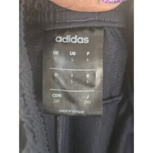 The Adidas 3 Stripes Track Pants in black are perfect for men's activewear. These loose fit pants feature a drawstring closure, elastic waist, and pockets for added comfort and convenience. Made of polyester knit fabric, these athletic style pants have a 30-inch inseam and a regular size large waist, ideal for all seasons. The classic track pants from Adidas Performance are designed for traditional sports activities or a casual athleisure look. Machine washable and with a straight leg style, these pants offer both style and functionality for the modern man.