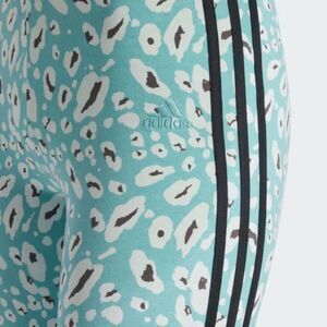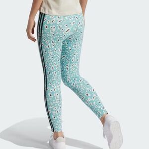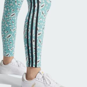 This listing is for a pair of NWT Adidas 3 Stripe Animal Print Leggings in size medium. The leggings feature a light blue animal print with the classic 3-stripe in black. Please see the photos for the measurements.