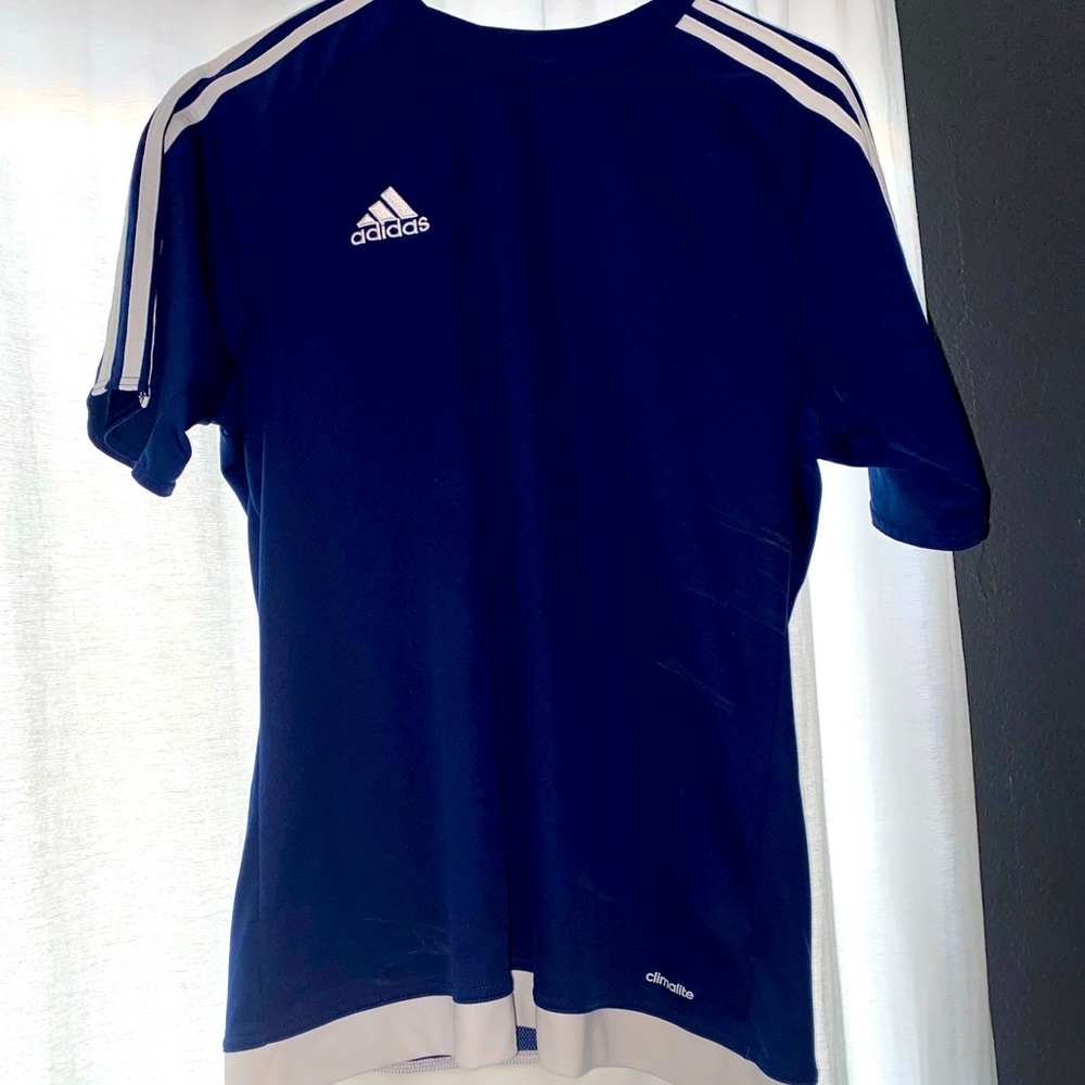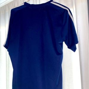 A blue with white stripes on the sleeves and it’s a MEDIUM in the US