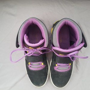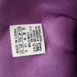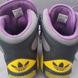 Size 10 Men’s ADIDAS Roundhouse basketball hi tops sneakers shoes for basketball, streetwear, etc. Style G20038. Black suede and smooth leather, purple and yellow trim, purple lace up design front, and velcro closure. Adidas wordmark gold trefoil logo on tongue and heel. From a smoke-free home. Good preowned condition. Please review all photos carefully to judge condition prior to purchasing. Item In Pictures Is the Exact Item You Are Purchasing.