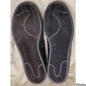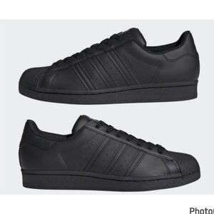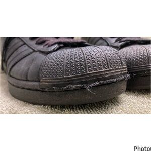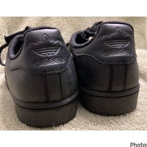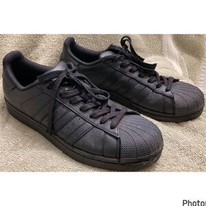 Hardly worn, like new condition Adidas Superstar Shoe! Solid black all leather shoe, size mens 9. Little to no creasing, however the only “flaw” I noticed is on the left shoe some of the stitching in the front has come loose. Doesn’t affect the wear or integrity of the shoe though!! Please pay attention to the photos!!
