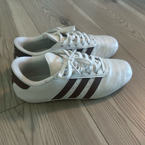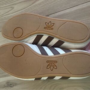 Classic Adidas design with white base and dark brown stripes. Comfortable and stylish for everyday wear.