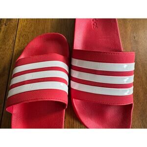 Classic Adidas Adilette Comfort slide sandals in red with white 3-stripe design. These are lightweight, cushioned slides designed for everyday wear, poolside, gym, or casual use. Features a contoured footbed and durable outsole for comfort and support. Men’s size 13.