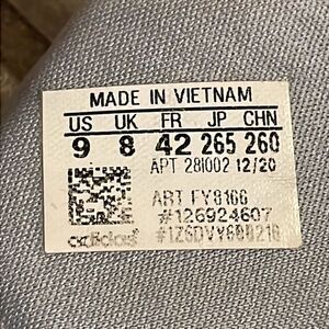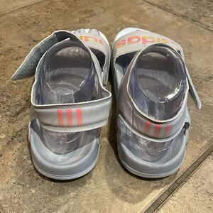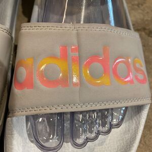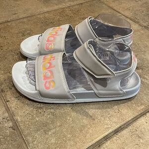 Adidas Adilette Halo Silver Blue, lightweight, strappy sandal, shoes in a women's size 9. Hook and loop closure. Pink and yellow graphics on vamp. Some creasing in the synthetic straps. Soles have signs of use. Clean insoles. Pre-owned with some signs of wear from normal use.