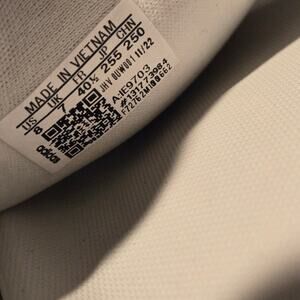These women's slides have a raised EVA platform and a synthetic bandage upper with metallic three-stripes. The colorway is often described as "Cloud White / Zero Metallic / Grey One".