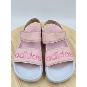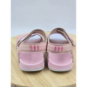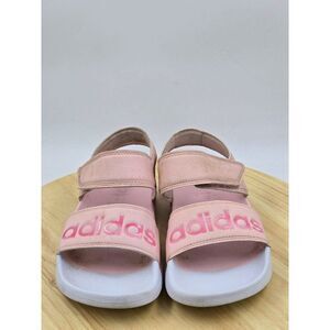 Pre-Owned Adidas Adilette Sandals Clear Pink/Cherry Metallic/Cloud White womens size 6. Flaws- some dirt staining on outsides an footbeds- some wear on bottom front soles see pictures above.