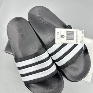 Brand new Adidas Adilette Shower Slides in classic black and white. Designed for comfort and style, these slides feature a contoured footbed and quick-drying upper — ideal for shower, gym, or casual wear.