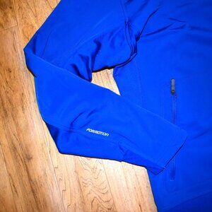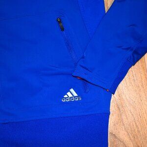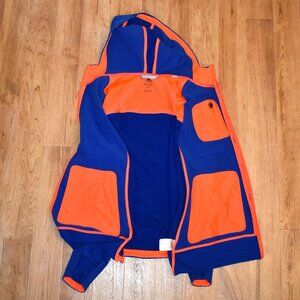Long sleeve full zip hooded lightweight jacket by Adidas. Size Large and 57% nylon/28% polyester/15% spandex (89% recycled polyester/11% spandex lining). Blue with orange trim. Reflective stripes on front/back shoulders. 3 outer zipper pockets. In excellent used condition with no holes, tears, or stains. Comes from a smoke free home.
