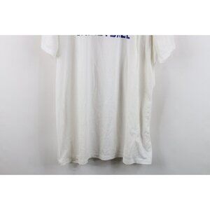 Stains front left/left shoulder, arms, bottom hem, collar, back. Sheer fabric. Collar, arms discolored. Yellowed. Graphics faded. Pilling
