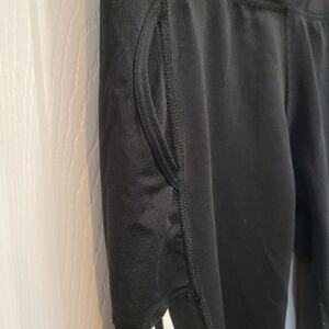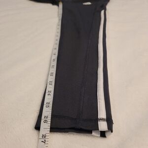 89% recycled polyester, 11% elastane. Tight compression type leggings with a mid rise. Classic Black and White Adidas. Side top thigh mesh, one side has stash pocket. Size Small. Excellent cleaned condition. Please compare measurements to something similar to ensure fit.