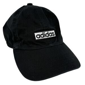 Designed for both men and women, this black hat is 100% cotton and features an adjustable strap for a comfortable fit. The iconic 'adidas' logo is prominently displayed in a white block embroidered on the front of the cap, adding a touch of sporty flair.
