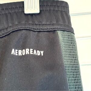 Description: Adidas Aeroready black athletic track pants with gray side stripes, pockets, and ankle zippers.